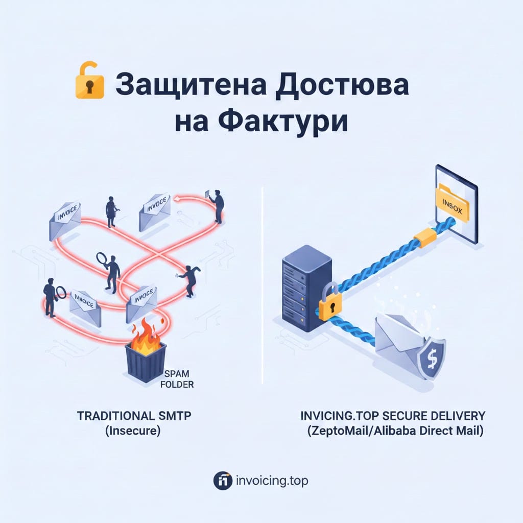 Когато изпратите фактура през онлайн платформа, тя изминава дълъг път от нашия сървър до пощенската кутия на вашия клиент. В invoicing.top вярваме, че сигурността не трябва да спира до бутона „Изпрати“. Ето защо взехме решение да не използваме стандартни, евтини решения за имейл, а да заложим на световни лидери като ZeptoMail и Alibaba Direct Mail.